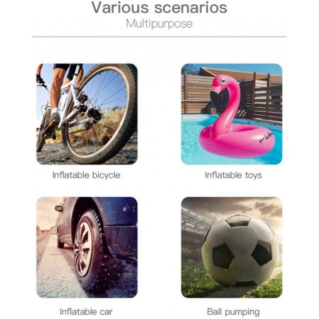 El diseño inalámbrico y el tamaño pequeño compacto hacen que el compresor de aire sea portátil y fácil de operar con una sola mano. El compresor está listo en solo 4 pasos. Una pantalla LCD indica la presión del aire. Adecuada para inflar cuando los neumáticos del coche son suficientes y se infla completamente los neumáticos de la bicicleta y de la motocicleta;